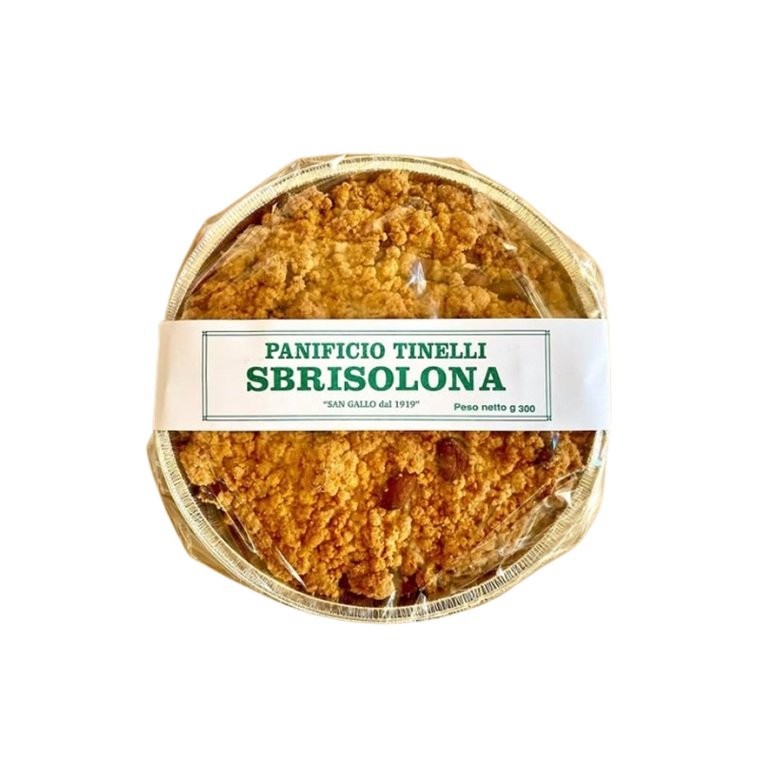 Autentiškas „Sbrisolona“ pyragas iš garsiosios „Panificio Tinelli“ kepyklos – tai ypatingas itališkas skanėstas, pasižymintis traškia, auksine tekstūra, švelniu sviesto aromatu ir gausiai paįvairintas migdoliniais riešutais. Puikiai tinka mėgautis su kava, pavaišinti svečius ar pasimėgauti ypatingomis akimirkomis. Pyragas yra maždaug 300 g svorio, gardžiai gelsvos spalvos, patiekiamas patraškančiais riešutų gabaliukais. Atraskite tikrą italų desertų tradiciją savo namuose!